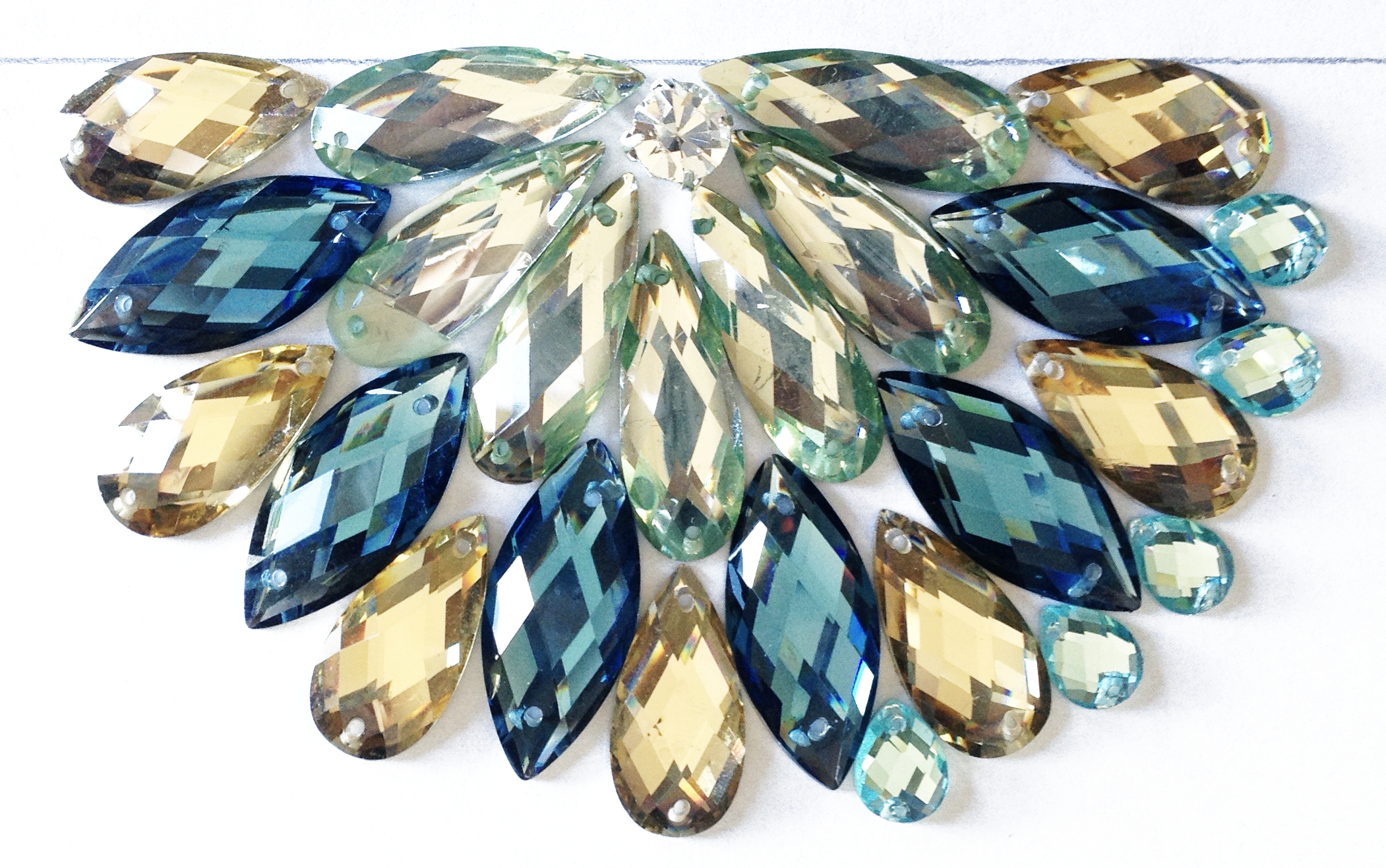 Swarovski crystal layout in warm mocha brown, dusty slate, and crisp aquamarine.