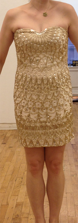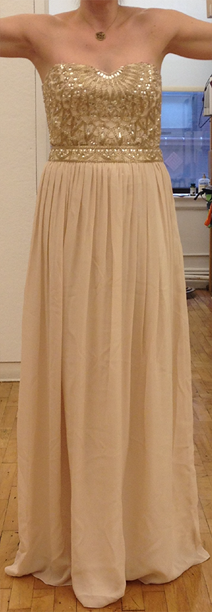 Factory sample set in champagne Swarovski crystals and faint gold beads on champagne polyester georgette.